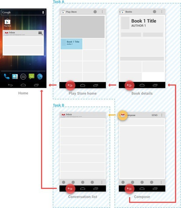 向上按钮被用于基于层级关系的应用程序中的界面切换。系统的“返回”按键是基于用户最近查看,以时间倒叙的方式连接的界面历史的导航(但有时候又不遵循这条逻辑)。
