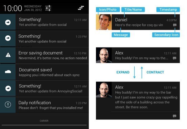 因Android的开放性,导致通知中心所显示的信息可进行相应的设计,但需注意以下几条:
