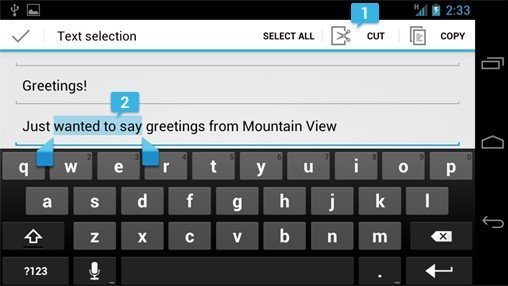 Android可以在文本框及其它文本视图中长按选择任何文字,这个操作会触发一个文本选择模式,便于扩展选择或对选定文本进行操作。同样,该选择模式会激活情境操作栏。Android 4.x对选择滑块的处理很优秀,便于用户选择,能够精确进行定位,单滑块进行光标定位时尤为管用。