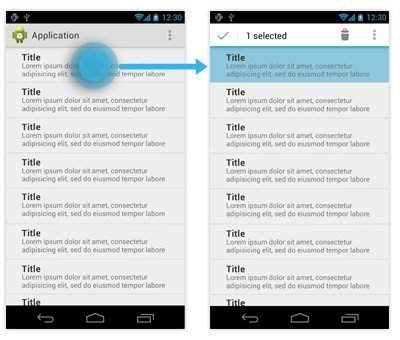 Android通过长按进入选择模式,选择内容后出现的情境操作栏(CAB)是一个覆盖在你的应用程序当前操作栏上的临时操作栏,它在用户长按某个可被选择的内容项后出现(图7,往上找哦)。 进入选择模式后,通过点击可选择多个内容项,在情境操作栏触发一个操作会应用到所有被选中的内容,执行操作后将退出选择模式,情景操作栏也随着消失。